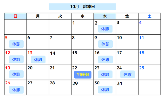 ●10月の臨時休診について 22日(水)午後、24日(金)終日